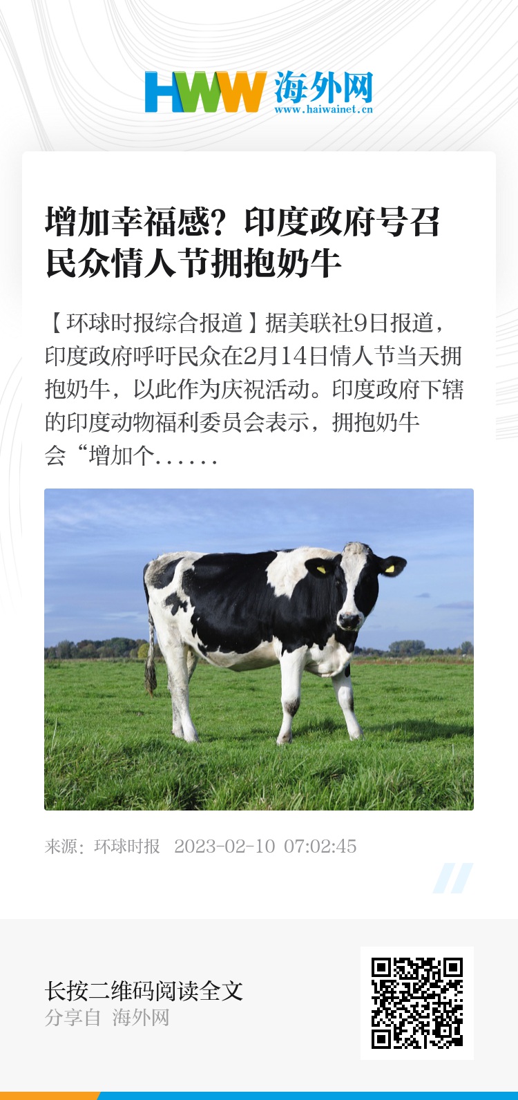 【环球时报综合报道】据美联社9日报道,印度政府呼吁民众在2月14日情人节当天拥抱奶牛,以此作为庆祝活动。印度政府下辖的印度动物福利委员会表示,拥抱奶牛会“增加个人和集体的幸福感。”在印度人口中占多数的印度教徒心中,奶牛是神圣的,且奶牛还是印度农业发展的重要支柱,自莫迪上台后,其领导的政府一直在推动提高动物地位的相关政策。印度动物福利委员会在一份声明中表示,鉴于牛为人类提供了财富,且与牛拥抱能带来幸福感,应该鼓励人们拥抱这种动物,因此决定将2月14日定为“拥抱奶牛日”。