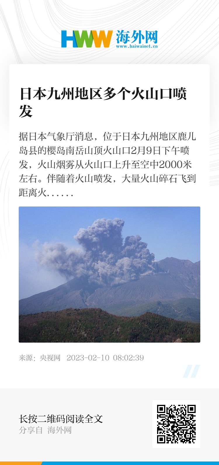 8日以来,樱岛地区火山活跃。距离南岳山顶不远的昭和火山口8日上午开始时隔5年的第一次小规模喷发。8日至9日该火山口共喷发3次,其中9日凌晨一次喷发的烟雾达1500米。