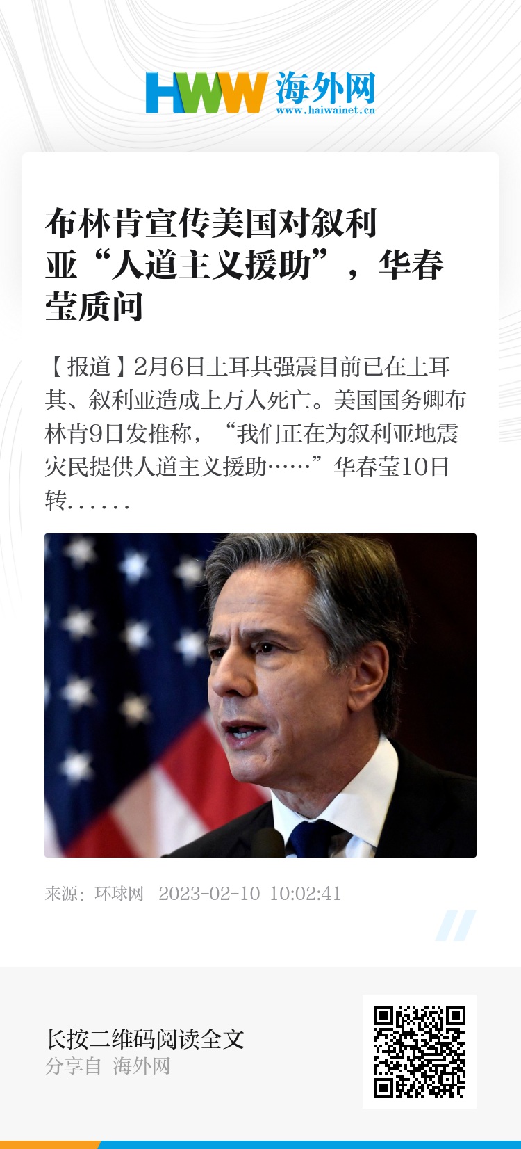 【环球网报道】2月6日土耳其强震目前已在土耳其、叙利亚造成上万人死亡。美国国务卿布林肯9日发推称,“我们正在为叙利亚地震灾民提供人道主义援助……”华春莹10日转发该推文并质问道,“那么为什么他们还在挣扎?”