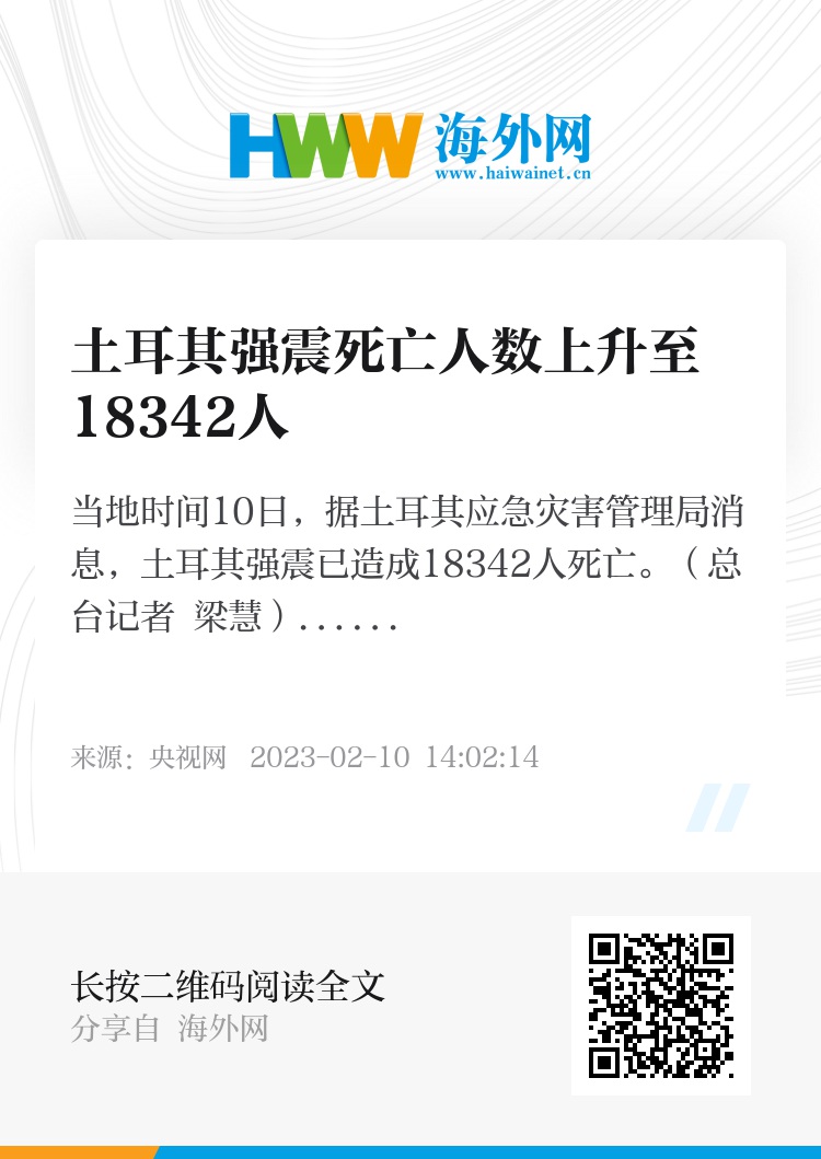当地时间10日,据土耳其应急灾害管理局消息,土耳其强震已造成18342人死亡。(总台记者 梁慧)