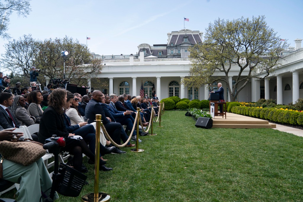 2022年4月11日,美国总统拜登(右一)在华盛顿白宫就监管“幽灵枪”的新规发表讲话。新华社记者刘杰摄