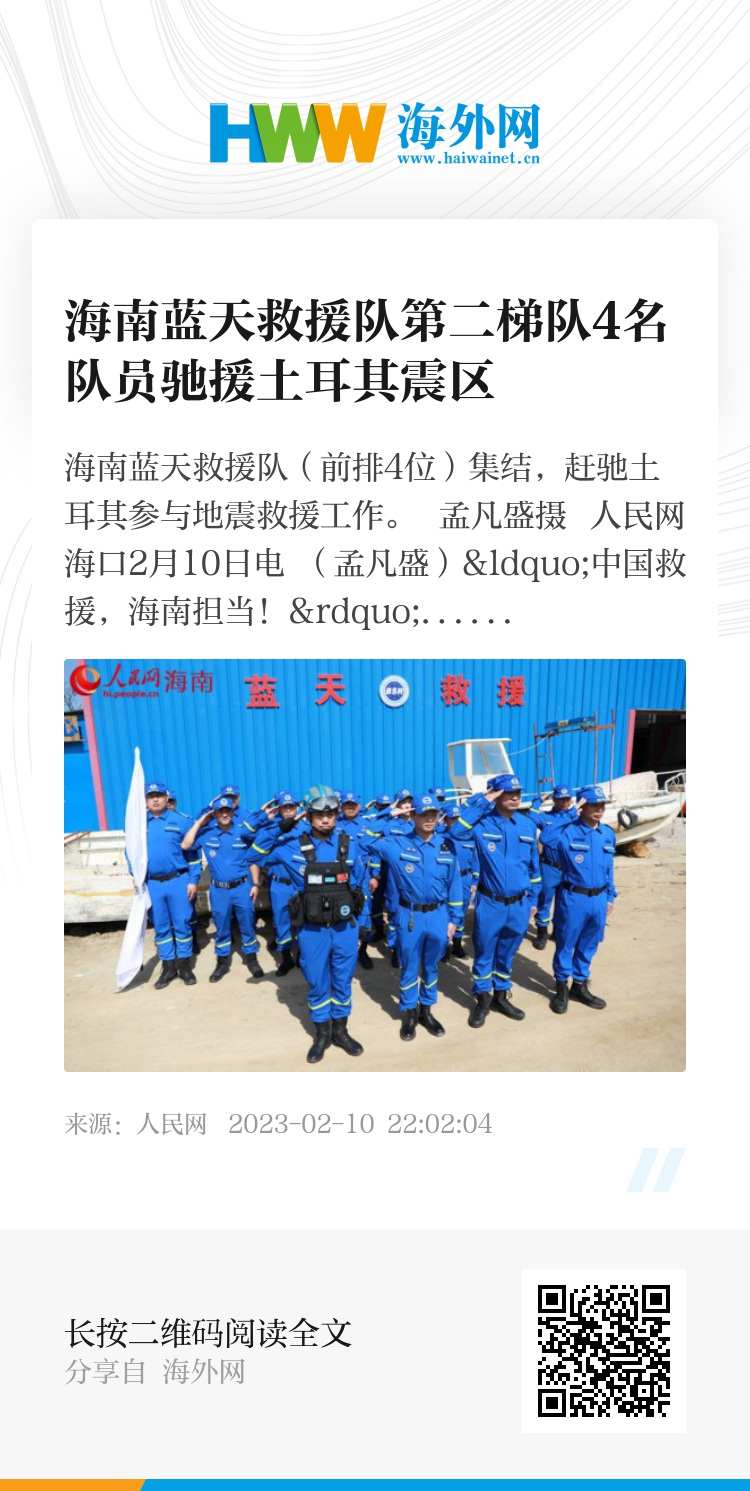 人民网海口2月10日电 (孟凡盛)“中国救援,海南担当!”2月10日下午,在高昂的口号声中,海南蓝天救援队第二梯队的4名队员已集结完毕,赶往土耳其参与地震救援工作。这4名队员于2月10日下午17:30从海口火车站出发,2月11日上午与来自全国各地的蓝天队员在广州集结,当天13:40分由白云机场飞往伊斯坦布尔。