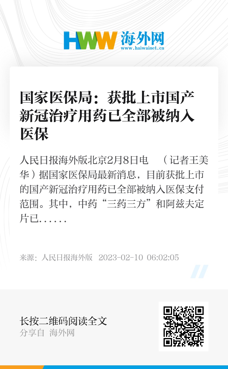 人民日报海外版北京2月8日电 (记者王美华)据国家医保局最新消息,目前获批上市的国产新冠治疗用药已全部被纳入医保支付范围。其中,中药“三药三方”和阿兹夫定片已正式纳入医保药品目录,氢溴酸氘瑞米德韦片、先诺特韦片/利托那韦片组合包装等药品临时性纳入医保支付范围。