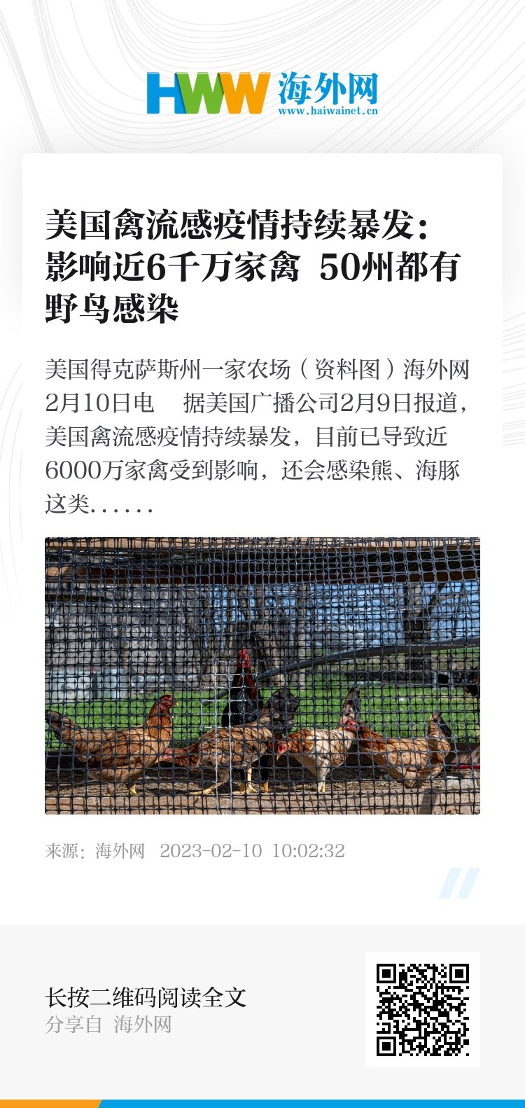 海外网2月10日电 据美国广播公司2月9日报道,美国禽流感疫情持续暴发,目前已导致近6000万家禽受到影响,还会感染熊、海豚这类哺乳动物。