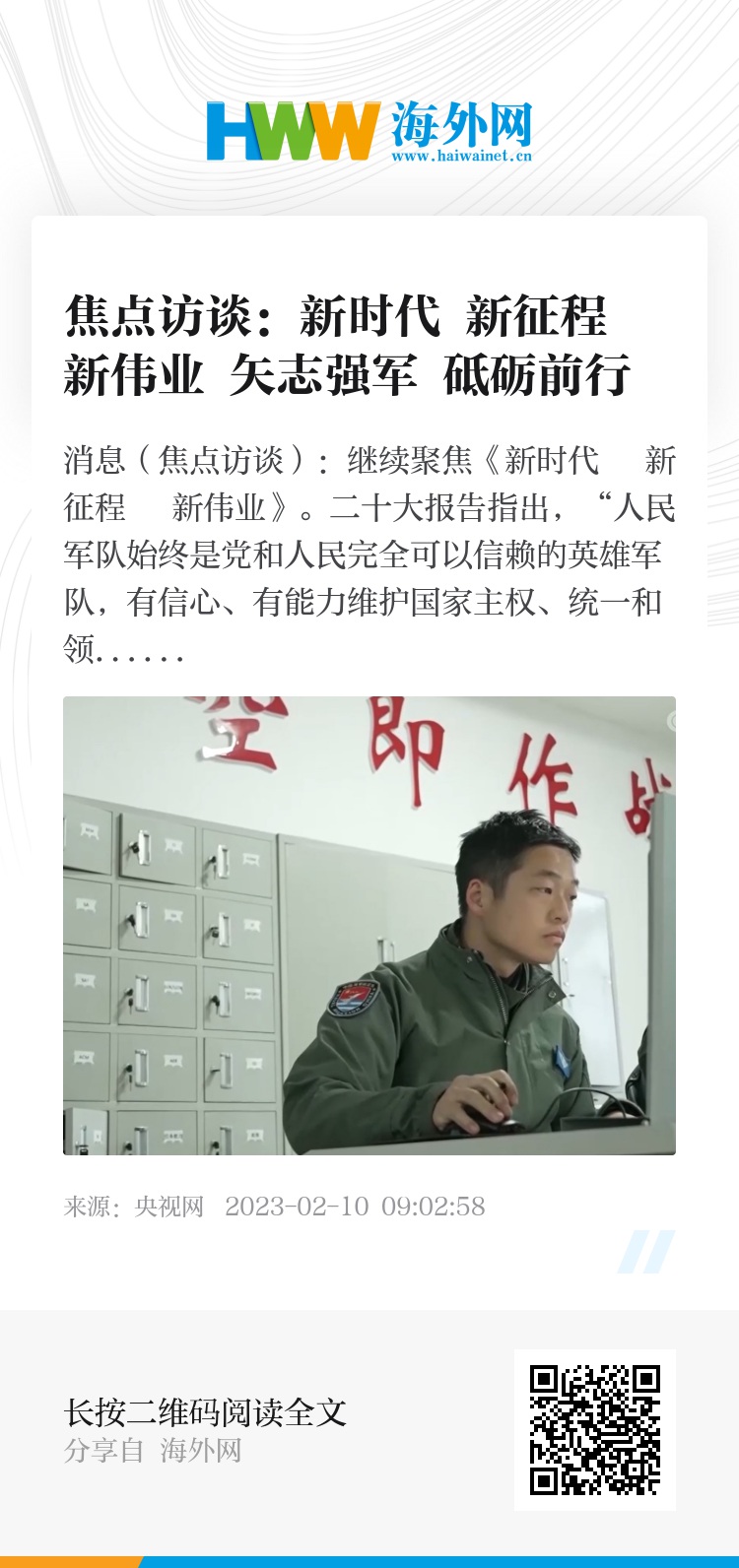 央视网消息(焦点访谈):继续聚焦《新时代 新征程 新伟业》。二十大报告指出,“人民军队始终是党和人民完全可以信赖的英雄军队,有信心、有能力维护国家主权、统一和领土完整,有信心、有能力为实现中华民族伟大复兴提供战略支撑,有信心、有能力为世界和平与发展作出更大贡献。”今天,就让我们走进一座座军营,去感受他们的训练和工作。