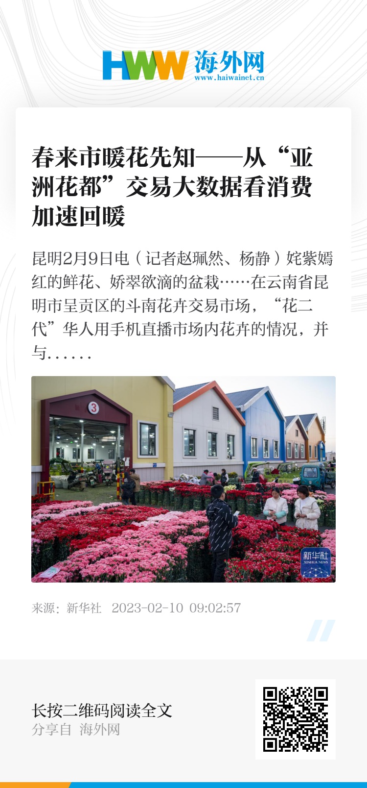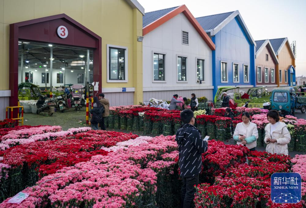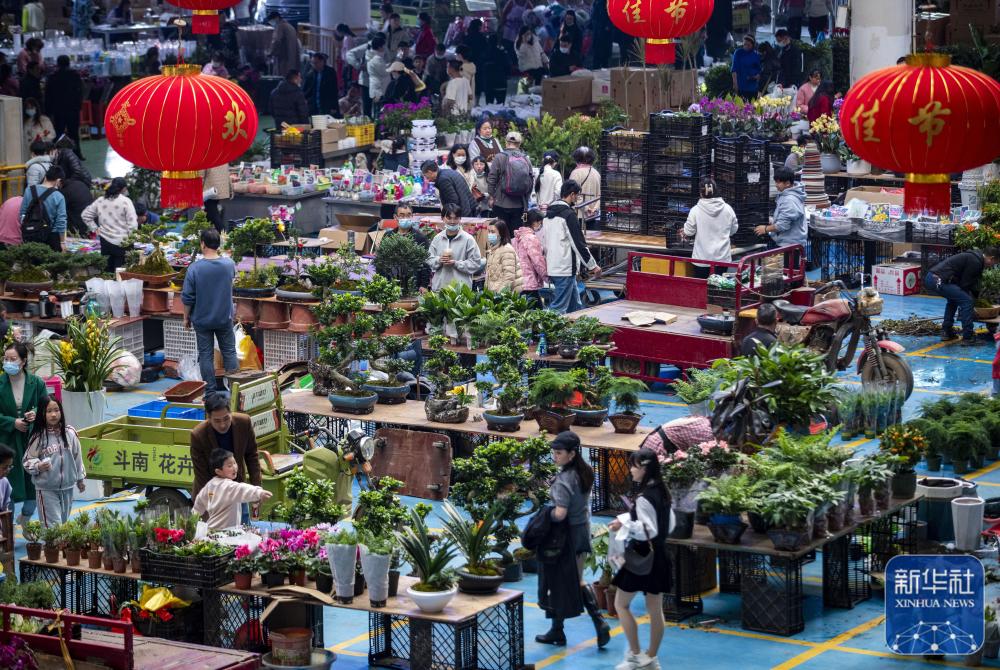 新华社昆明2月9日电(记者赵珮然、杨静)姹紫嫣红的鲜花、娇翠欲滴的盆栽……在云南省昆明市呈贡区的斗南花卉交易市场,“花二代”华人用手机直播市场内花卉的情况,并与国外客商对接花卉进出口事宜。