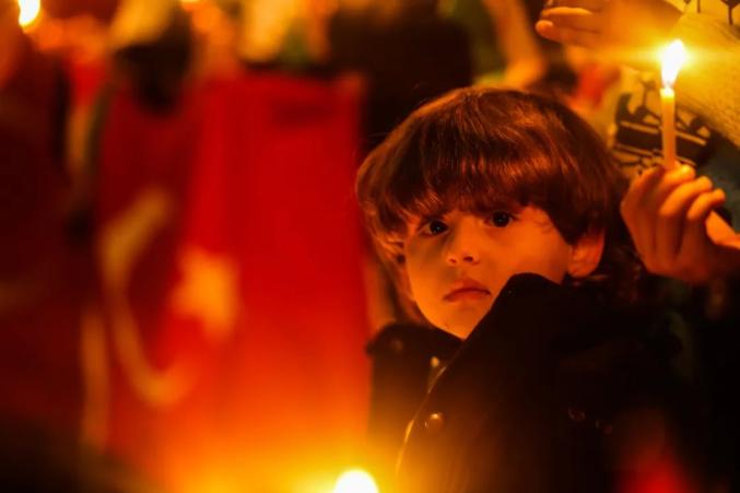 2月7日,在加沙地带汗尤尼斯,一名儿童手拿蜡烛悼念地震遇难者。新华社发(亚西尔摄)