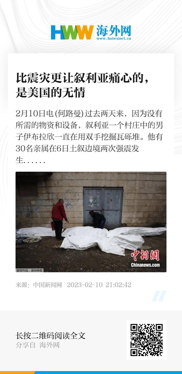 “美国官员可以撒谎,但叙利亚地震灾区的照片不会说谎。”叙外交部表示,尽管面临制裁,叙人民依然以充满力量和坚定的意志来应对灾难。