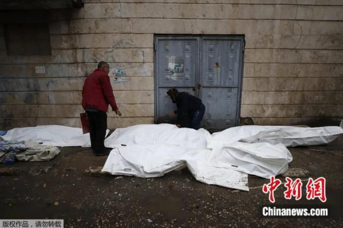 2023年2月6日,叙利亚阿勒颇,人们试图在医院外辨认地震遇难者的遗体。