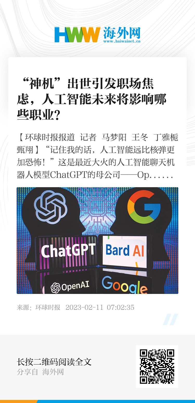 【环球时报报道 记者 马梦阳 王冬 丁雅栀 甄翔】“记住我的话,人工智能远比核弹更加恐怖!”这是最近大火的人工智能聊天机器人模型ChatGPT的母公司——OpenAI的联合创始人埃隆·马斯克此前对于人工智能发出的“危险警告”。ChatGPT上线数月以来,来自全球的试用者们惊奇地发现,它表现出了可以部分代替人工完成创作剧本、撰写研报、应用编程等复杂工作的出色能力。一场关于人类未来职业的讨论由此掀起,马斯克的上述言论也在社交媒体上被“挖出”并广泛流传。未来的人工智能(AI)究竟是抹杀工作机会的“洪水猛兽”,还是为各行业带来新生的福音?《环球时报》记者为此采访多位行业人士和专家。