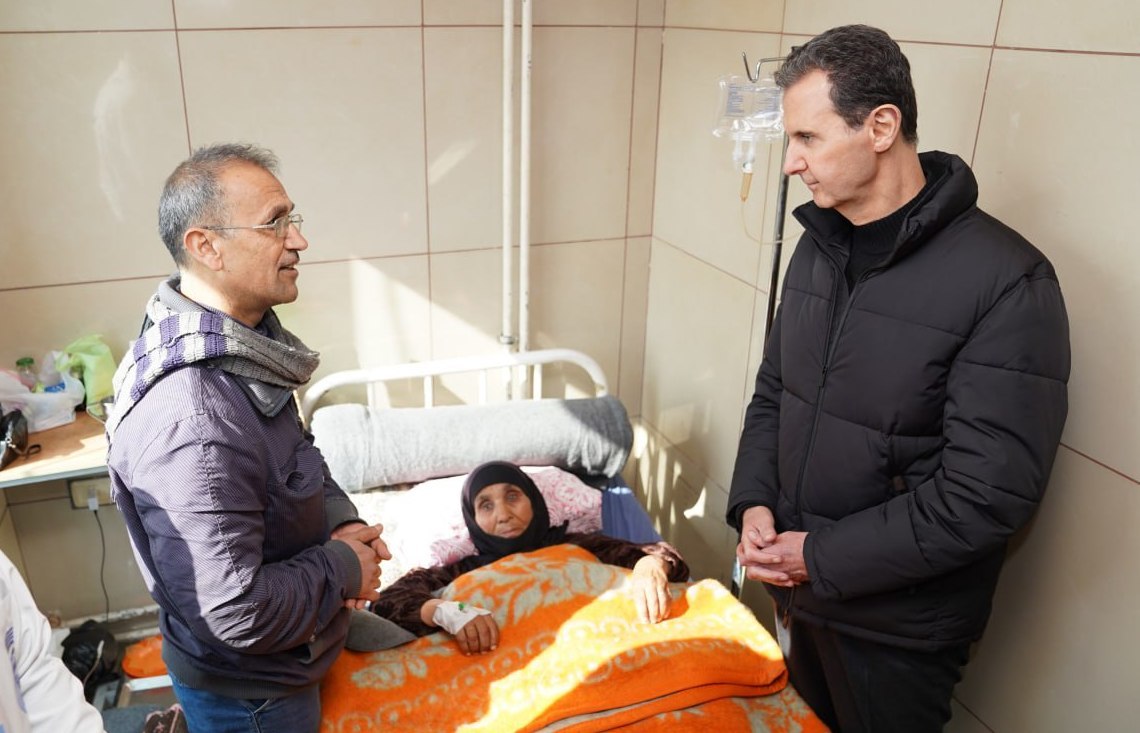 当地时间2月10日,叙利亚总统阿萨德前往阿勒颇大学医院,看望在地震中受伤的民众。