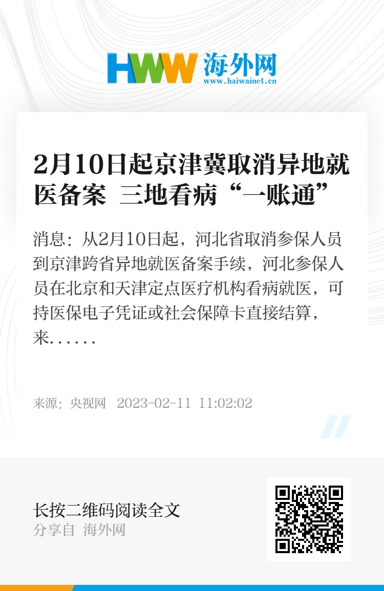 央视网消息:从2月10日起,河北省取消参保人员到京津跨省异地就医备案手续,河北参保人员在北京和天津定点医疗机构看病就医,可持医保电子凭证或社会保障卡直接结算,来看记者在北京的探访。