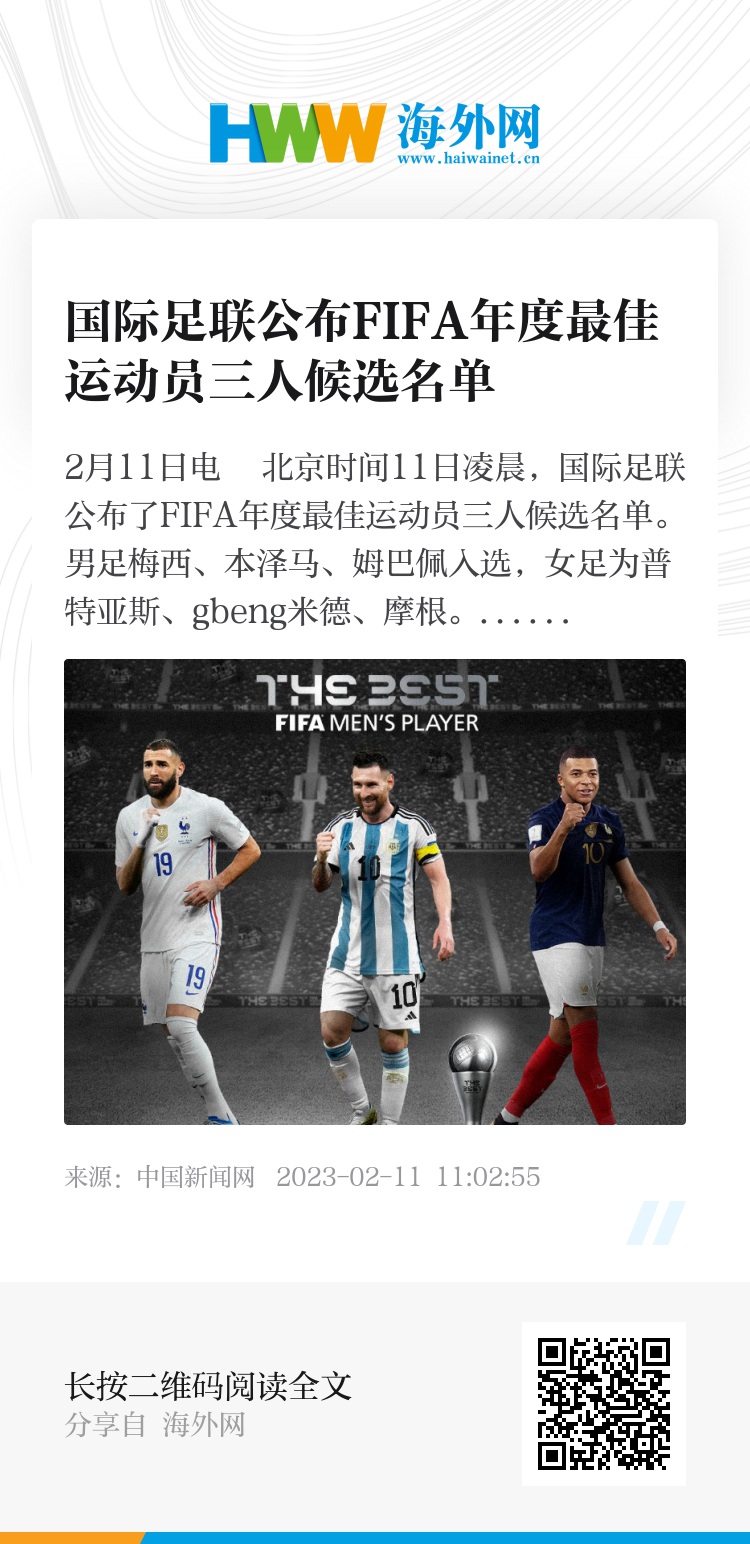 中新网2月11日电 北京时间11日凌晨,国际足联公布了FIFA年度最佳运动员三人候选名单。男足梅西、本泽马、姆巴佩入选,女足为普特亚斯、gbeng米德、摩根。