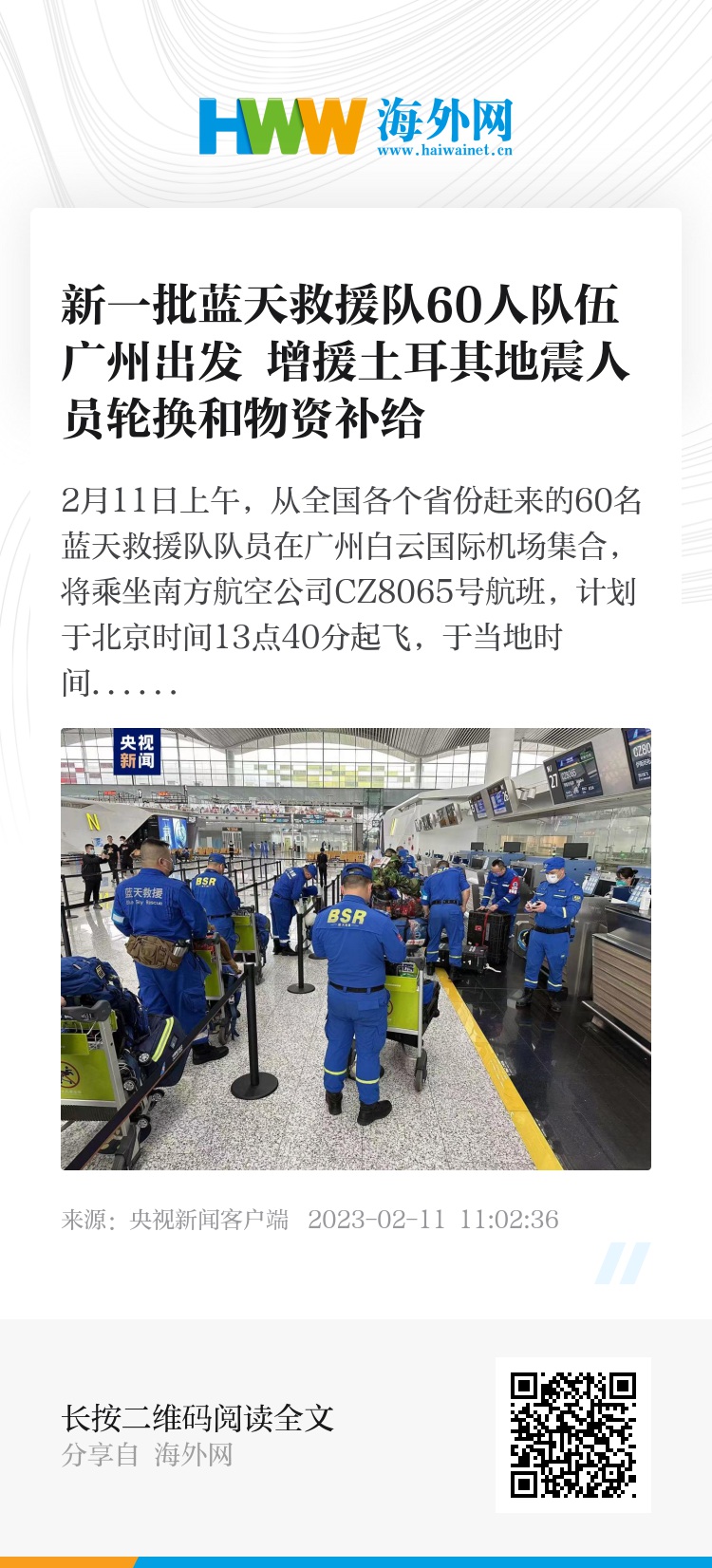 2月11日上午,从全国各个省份赶来的60名蓝天救援队队员在广州白云国际机场集合,将乘坐南方航空公司CZ8065号航班,计划于北京时间13点40分起飞,于当地时间2月11日19点50分落地伊斯坦布尔,抵达后将连夜转战阿德亚曼省,主要增援土耳其地震救援的人员轮换和物资补给工作。