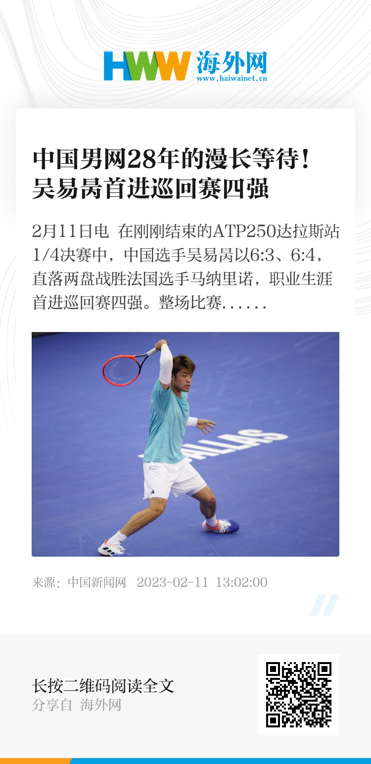 中新网2月11日电 在刚刚结束的ATP250达拉斯站1/4决赛中,中国选手吴易昺以6:3、6:4,直落两盘战胜法国选手马纳里诺,职业生涯首进巡回赛四强。