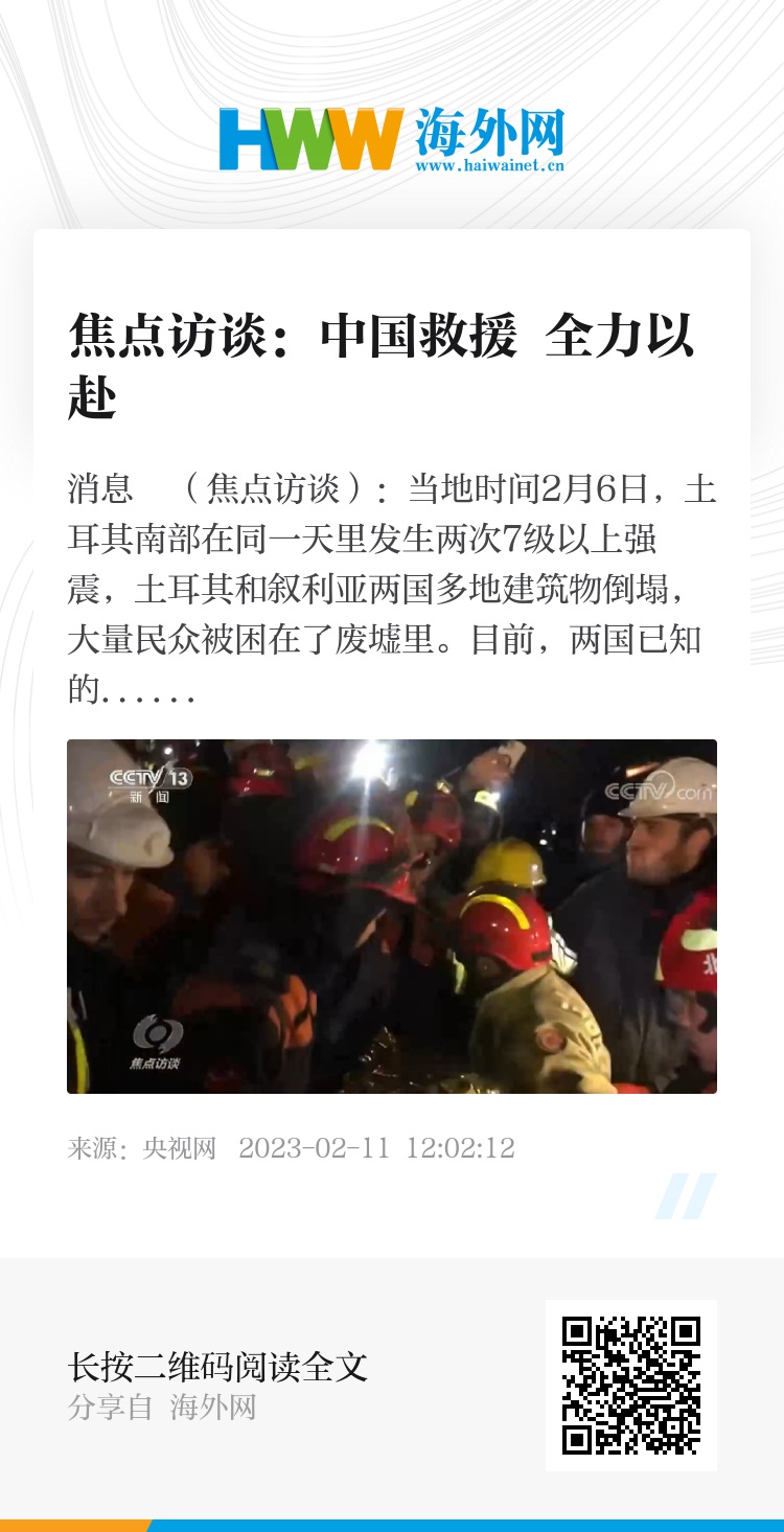 在中国救援队出发后,土耳其驻华使馆在网络上发文表示感谢。叙利亚驻华使馆也特意对中国民众的爱心捐款表示了谢意。救援不分国界,因为人类本是一个命运共同体。守望相助、同舟共济,这是中华民族的传统美德,也闪耀着命运与共的人性光辉,彰显着中国负责任的大国担当。灾难面前,我们共望平安。期待废墟中能出现更多的奇迹,期待土叙两国能早日渡过难关。