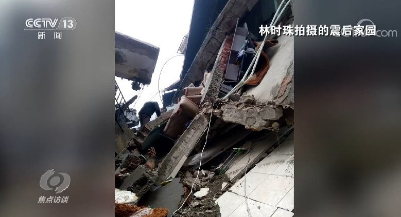 林时珠:“我感到摇晃的时候赶紧就喊他们起床,他们起来的时候还是蒙的,都没有反应过来,突然一边客厅就塌了,他们才反应过来,真的是地震了。我们稍微缓一点之后想从门口跑,还想拿重要的证件什么的,所有的门都被堵住了。我们住四楼,想从阳台出来,阳台的门也都堵住了,想敲玻璃,阳台外面也全都是废墟。我们的一个沙发顶住了,有一个洞,我们从那里钻出来的。”