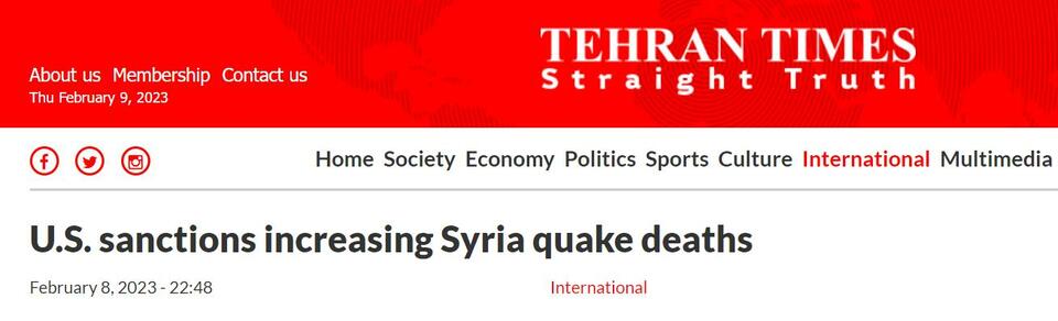报道写道,“多名消息人士向阿拉伯媒体透露,大量航空货运公司因畏惧美国与欧洲的制裁而不敢降落在叙利亚的机场。多个国家提出,要求叙利亚本国民航客机参与运输救援物资以规避制裁”。报道最后表示,叙利亚外长费萨尔·梅克达德强调,对叙制裁加大了灾难的危害,“如果西方国家不能履行他们的人道主义义务,历史将不会遗忘”。