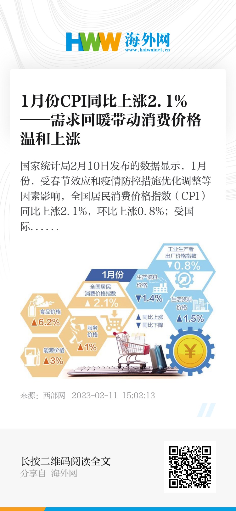 国家统计局2月10日发布的数据显示,1月份,受春节效应和疫情防控措施优化调整等因素影响,全国居民消费价格指数(CPI)同比上涨2.1%,环比上涨0.8%;受国际原油价格波动和国内煤炭价格下行等因素影响,工业生产者出厂价格指数(PPI)同比下降0.8%。