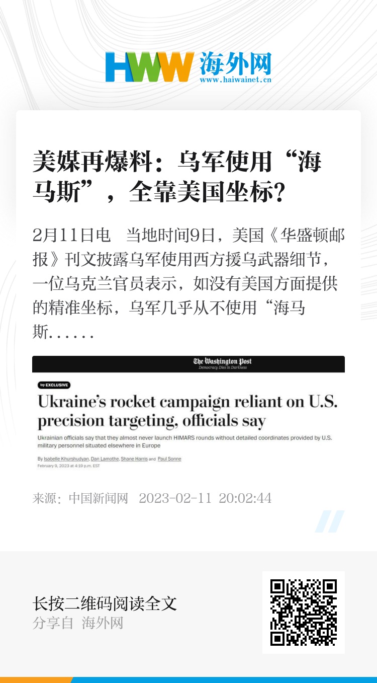 中新网2月11日电 当地时间9日,美国《华盛顿邮报》刊文披露乌军使用西方援乌武器细节,一位乌克兰官员表示,如没有美国方面提供的精准坐标,乌军几乎从不使用“海马斯”火箭炮(HIMARS)。