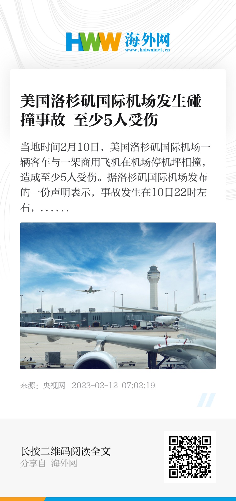 当地时间2月10日,美国洛杉矶国际机场一辆客车与一架商用飞机在机场停机坪相撞,造成至少5人受伤。
