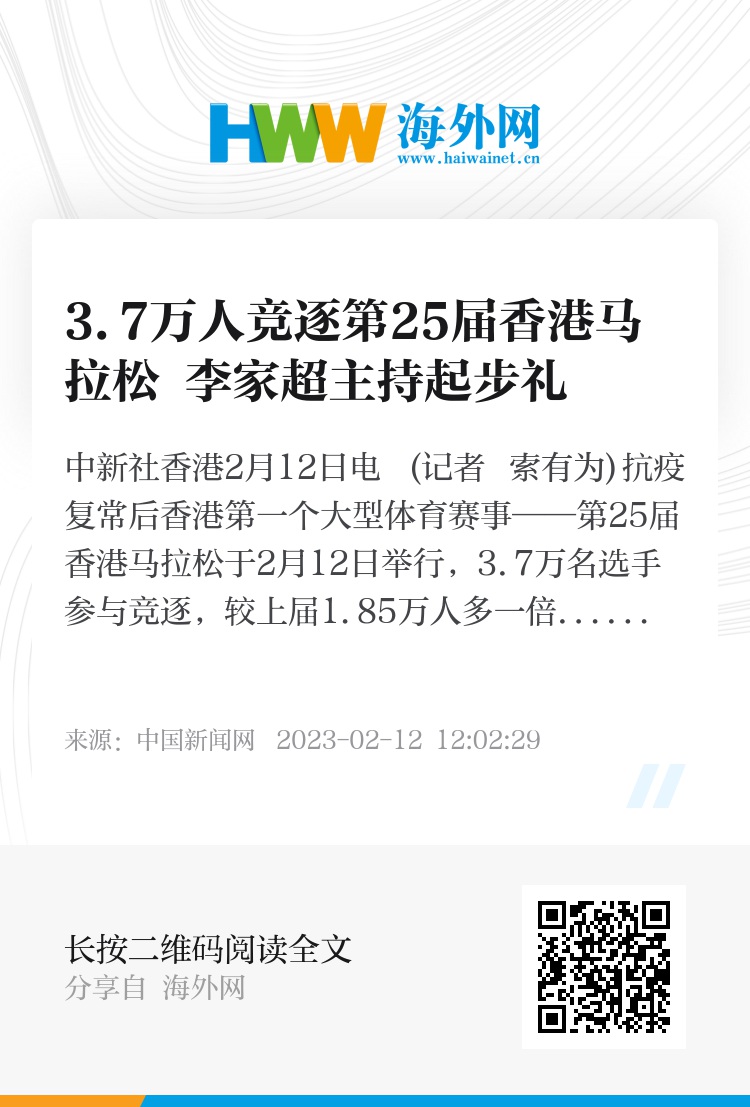 中新社香港2月12日电 (记者 索有为)抗疫复常后香港第一个大型体育赛事——第25届香港马拉松于2月12日举行,3.7万名选手参与竞逐,较上届1.85万人多一倍。香港特区行政长官李家超主持起步礼并为选手加油打气。