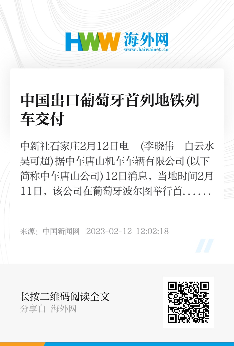 中新社石家庄2月12日电 (李晓伟 白云水 吴可超)据中车唐山机车车辆有限公司(以下简称中车唐山公司)12日消息,当地时间2月11日,该公司在葡萄牙波尔图举行首列地铁列车交付暨“公众开放日”活动,这是中国首个出口欧盟国家城轨车辆的首次亮相。