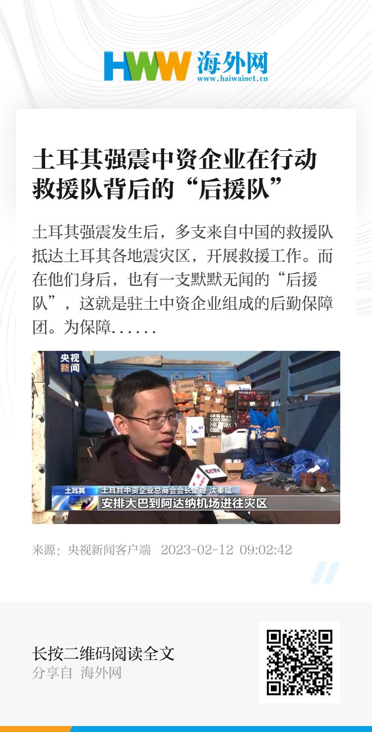 土耳其中资企业总商会会长助理 沈秦威:为他们(来自中国的救援队)安排航班,安排大巴到阿达纳机场进往灾区,包括我们在一些中国救援队的一些应急物资上,比如说像灾区急需的柴油、汽油、润滑油、机油等急需的一些能源,还有一些柴米油盐。我们常说兵马未动,粮草先行,我们主要是做这方面的物资保障。