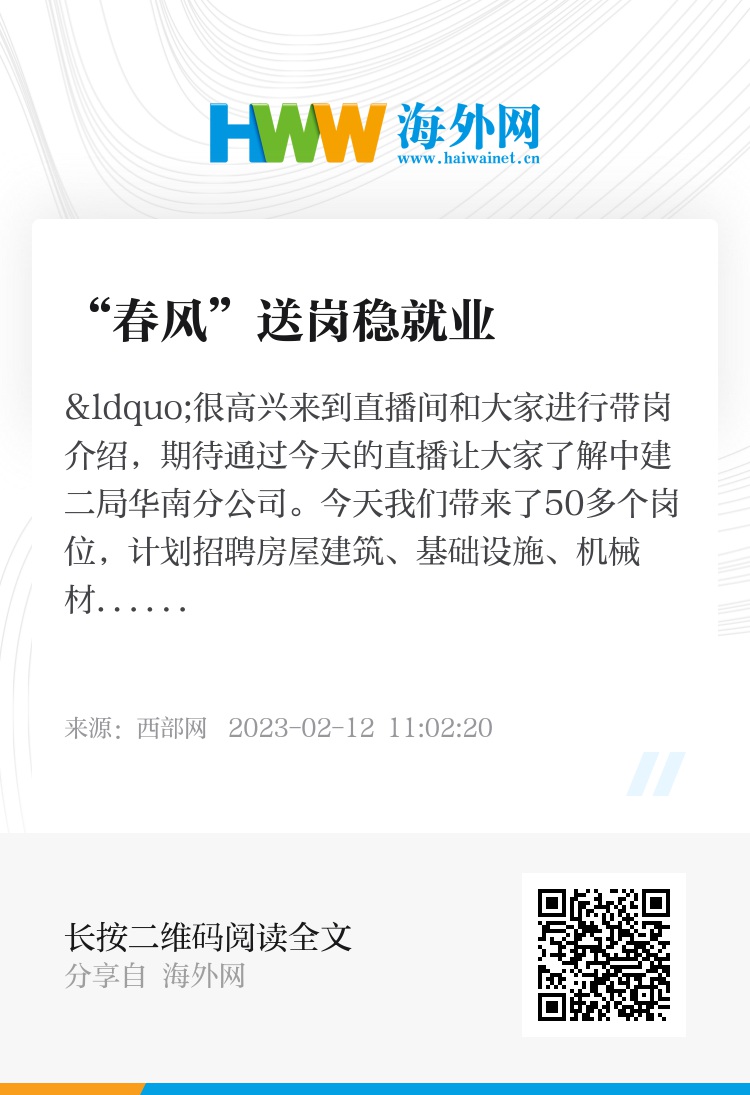 “很高兴来到直播间和大家进行带岗介绍,期待通过今天的直播让大家了解中建二局华南分公司。今天我们带来了50多个岗位,计划招聘房屋建筑、基础设施、机械材料、财务资金等方面的专业人才,欢迎优秀毕业生们投递简历。”2月2日上午,中国建筑第二工程局有限公司华南分公司人力资源部招聘经理张雨濛在2023年春风行动暨就业援助月、“南粤春暖”稳就业促发展特别行动专场招聘会上现场通过直播开展新一季的人才招聘。