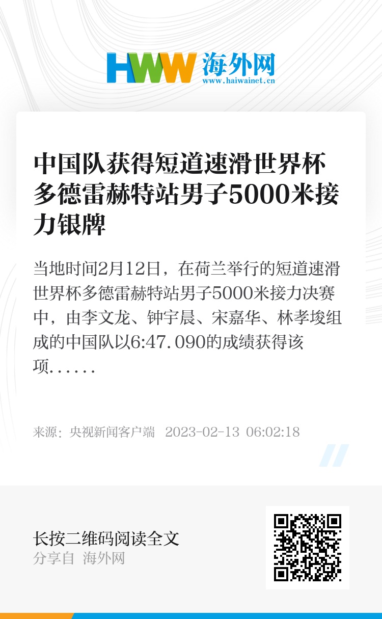 当地时间2月12日,在荷兰举行的短道速滑世界杯多德雷赫特站男子5000米接力决赛中,由李文龙、钟宇晨、宋嘉华、林孝埈组成的中国队以6:47.090的成绩获得该项目银牌。