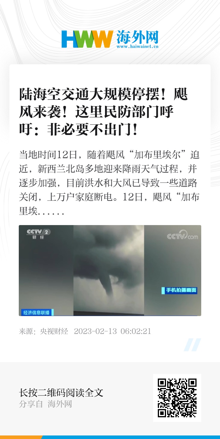 目前,奥克兰市内的火车以及轮渡服务都已经停运,海港大桥也已关闭。新西兰航空表示,已经取消了14日中午之前所有往返奥克兰的国内航班,以及部分国际航班。民防部门敦促新西兰北岛的居民留在家中,没有必要不要出门。两周前,飓风“黑尔”过境新西兰,该国南北岛部分地区受灾,在奥克兰市造成4人死亡。