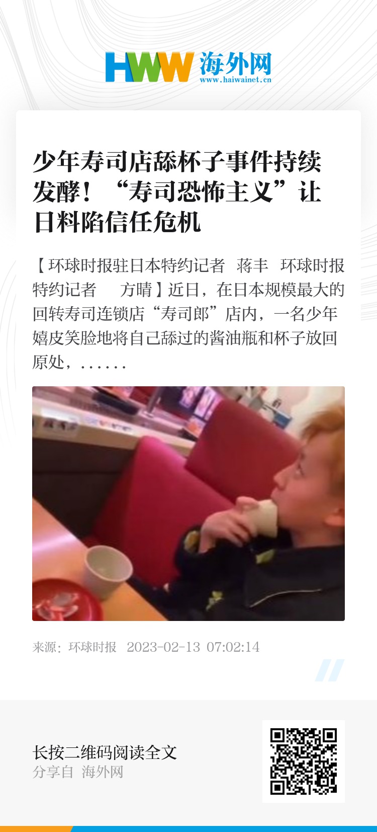 【环球时报驻日本特约记者 蒋丰 环球时报特约记者 方晴】近日,在日本规模最大的回转寿司连锁店“寿司郎”店内,一名少年嬉皮笑脸地将自己舔过的酱油瓶和杯子放回原处,用沾了口水的手指戳回转带上的寿司,并拍成视频上传社交媒体,此事持续发酵,被称为“寿司恐怖主义事件”,打脸了号称“安全无毒”的日本饮食文化。