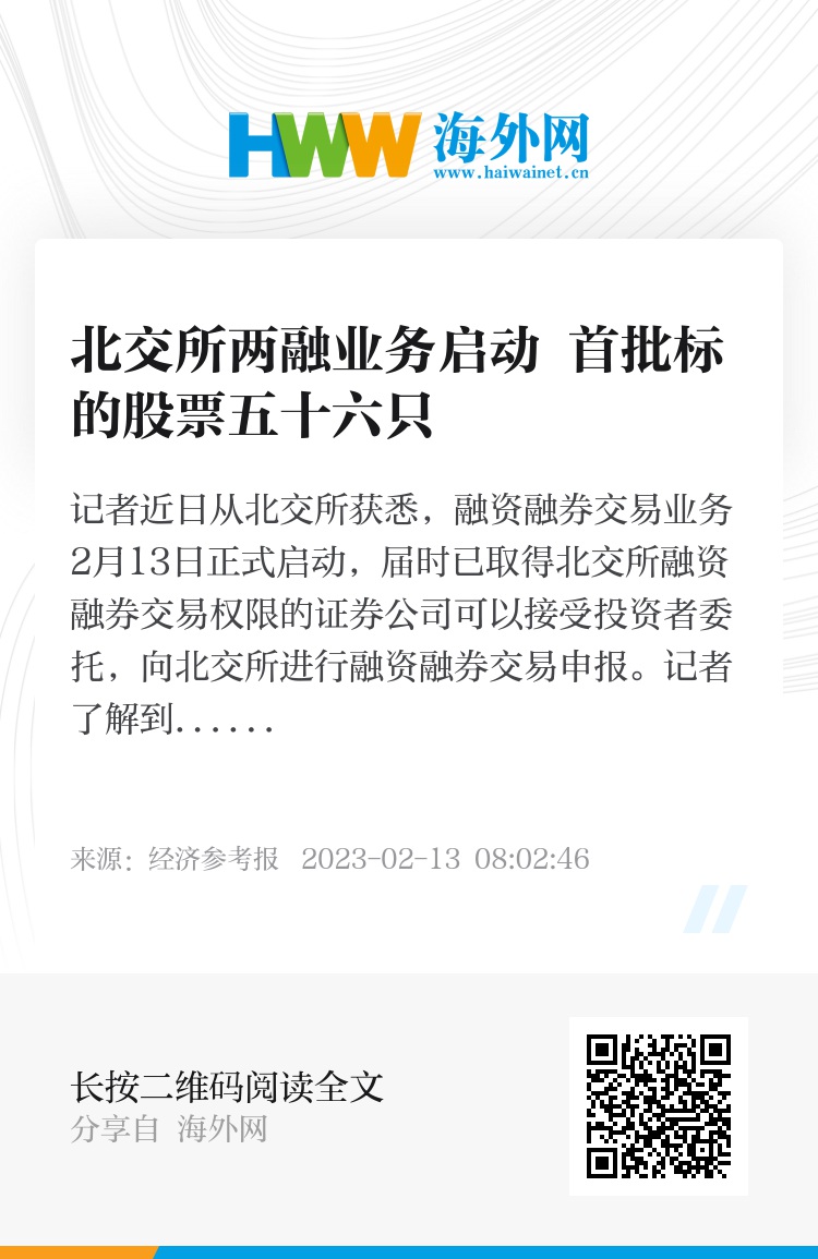 记者近日从北交所获悉,融资融券交易业务2月13日正式启动,届时已取得北交所融资融券交易权限的证券公司可以接受投资者委托,向北交所进行融资融券交易申报。