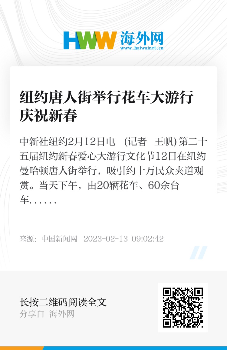 据了解,这是历届新春爱心大游行文化节中唯一一辆3D立体造型设计花车,由多次承接纽约梅西百货感恩节大游行花车事务的公司设计制作。花车“船头”矗立着沧州铁狮主视觉元素,花车上还有舞狮表演。活动组织方美国繁荣华埠协会工作人员表示,这辆花车在舞龙舞狮的氛围中让美国民众感受到了沧州及这座城市的文化底蕴。