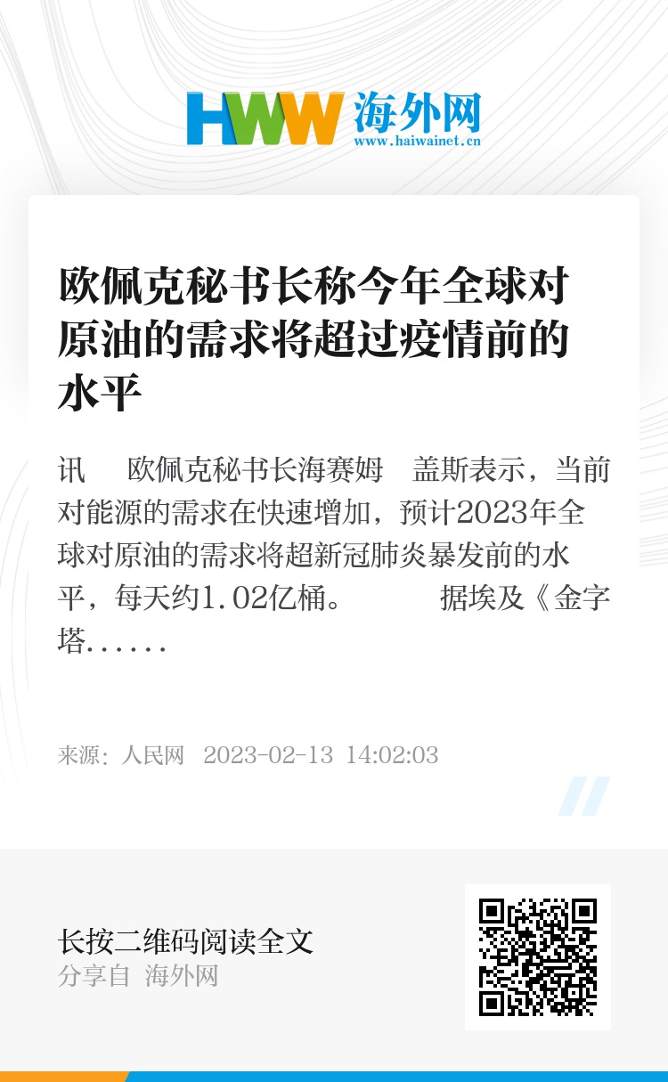人民网讯 欧佩克秘书长海赛姆・盖斯表示,当前对能源的需求在快速增加,预计2023年全球对原油的需求将超新冠肺炎暴发前的水平,每天约1.02亿桶。
