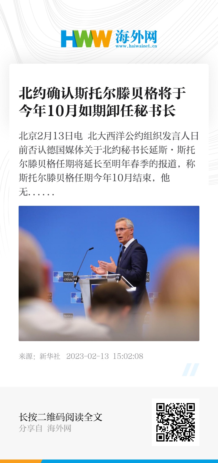 新华社北京2月13日电 北大西洋公约组织发言人日前否认德国媒体关于北约秘书长延斯·斯托尔滕贝格任期将延长至明年春季的报道,称斯托尔滕贝格任期今年10月结束,他无意寻求继续担任这一职务。