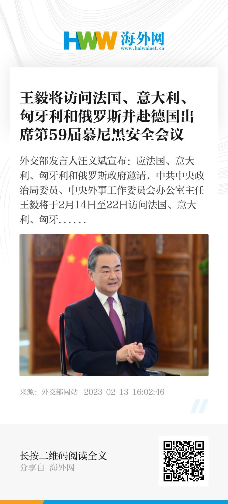 应法国、意大利、匈牙利和俄罗斯政府邀请,中共中央政治局委员、中央外事工作委员会办公室主任王毅将于2月14日至22日访问法国、意大利、匈牙利和俄罗斯,并应邀出席第59届慕尼黑安全会议,在中国专场活动上发表演讲,宣介习近平主席倡导的共同、综合、合作、可持续的安全观,阐明中国将始终坚持走和平发展道路,并结合会议主题就重大国际问题介绍中方立场。