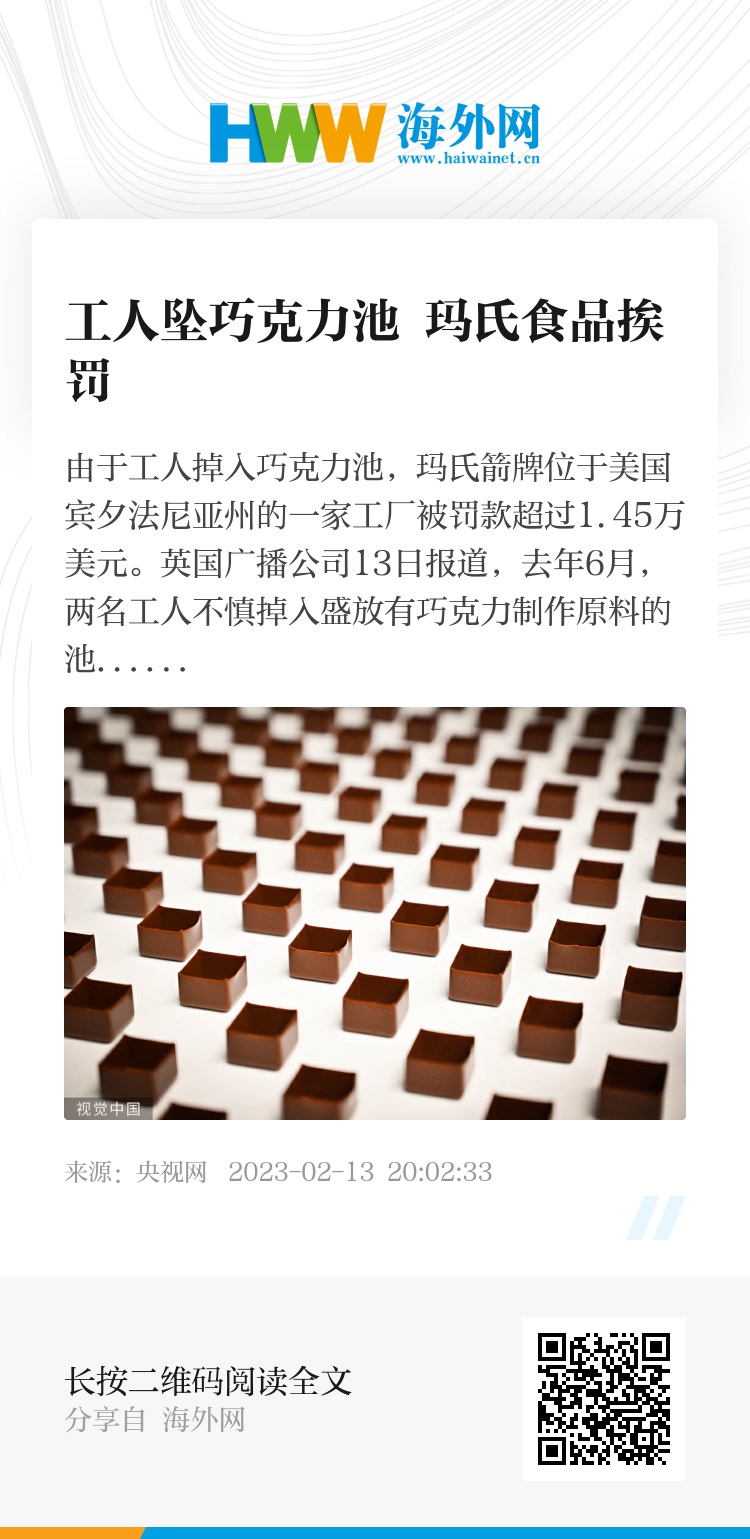 由于工人掉入巧克力池,玛氏箭牌位于美国宾夕法尼亚州的一家工厂被罚款超过1.45万美元。
