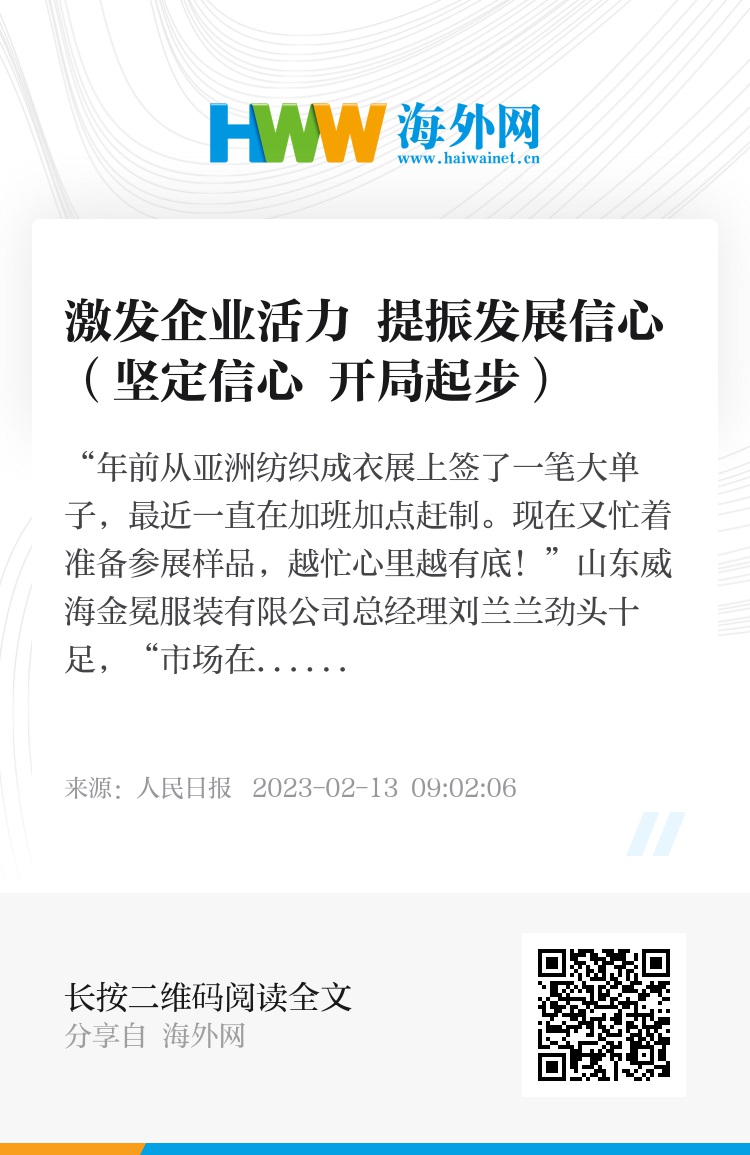 “年前从亚洲纺织成衣展上签了一笔大单子,最近一直在加班加点赶制。现在又忙着准备参展样品,越忙心里越有底!”山东威海金冕服装有限公司总经理刘兰兰劲头十足,“市场在回暖,国家有帮扶,我们更有信心迈开脚步,努力开拓更大市场!”