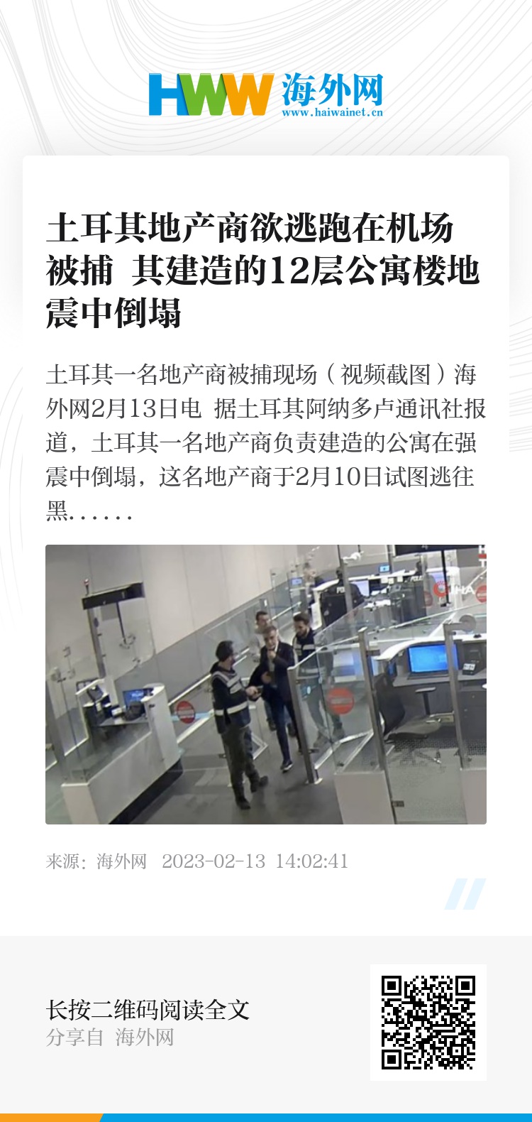 海外网2月13日电 据土耳其阿纳多卢通讯社报道,土耳其一名地产商负责建造的公寓在强震中倒塌,这名地产商于2月10日试图逃往黑山,在伊斯坦布尔机场被警方逮捕。