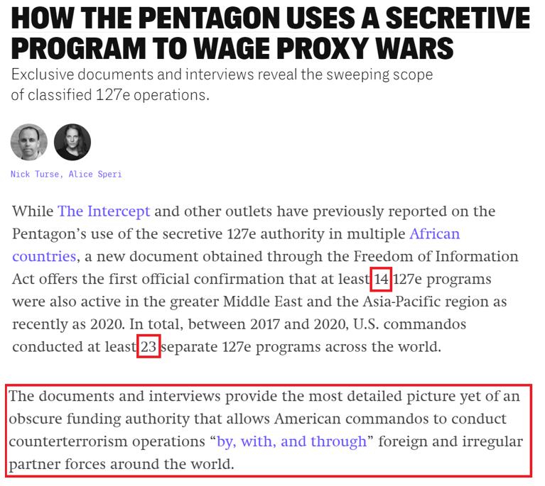 有美媒此前披露,仅在2017年至2020年间,美国就通过一个名为“127e”的秘密项目,在全球开展了至少23次“代理人战争”,其中至少14次发生在中东和亚太地区。