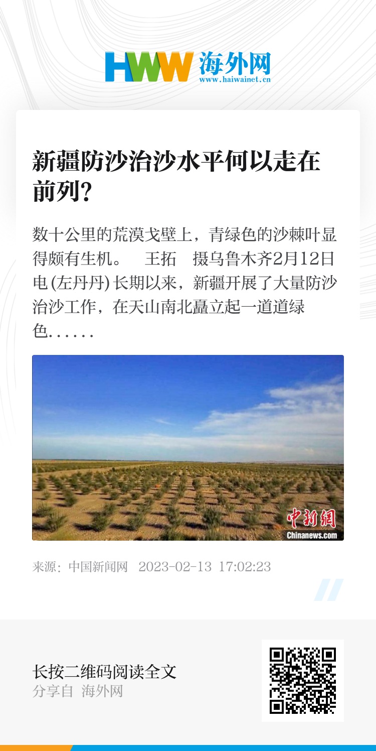 中新网乌鲁木齐2月12日电(左丹丹)长期以来,新疆开展了大量防沙治沙工作,在天山南北矗立起一道道绿色屏障,使新疆荒漠化、沙化土地发展势头得到遏制,作为全国沙化土地面积最大、分布最广、危害最严重的省区,新疆防沙治沙水平何以能够走在前列?