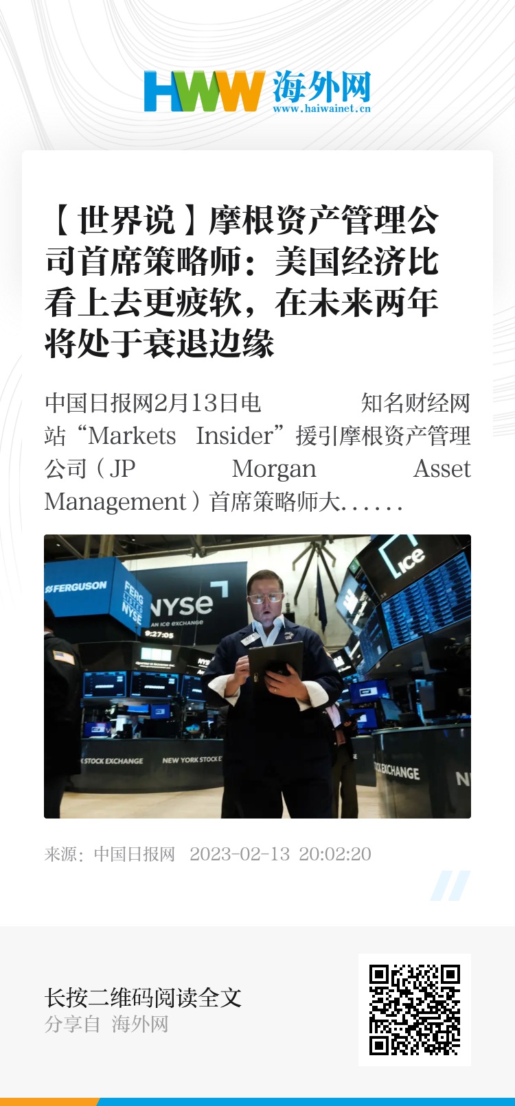 中国日报网2月13日电 知名财经网站“Markets Insider”援引摩根资产管理公司(JP Morgan Asset Management)首席策略师大卫·凯利(David Kelly)的话报道称,美国经济实际上比数据显示的要更加疲软,未来几年内仍将处于衰退的边缘。