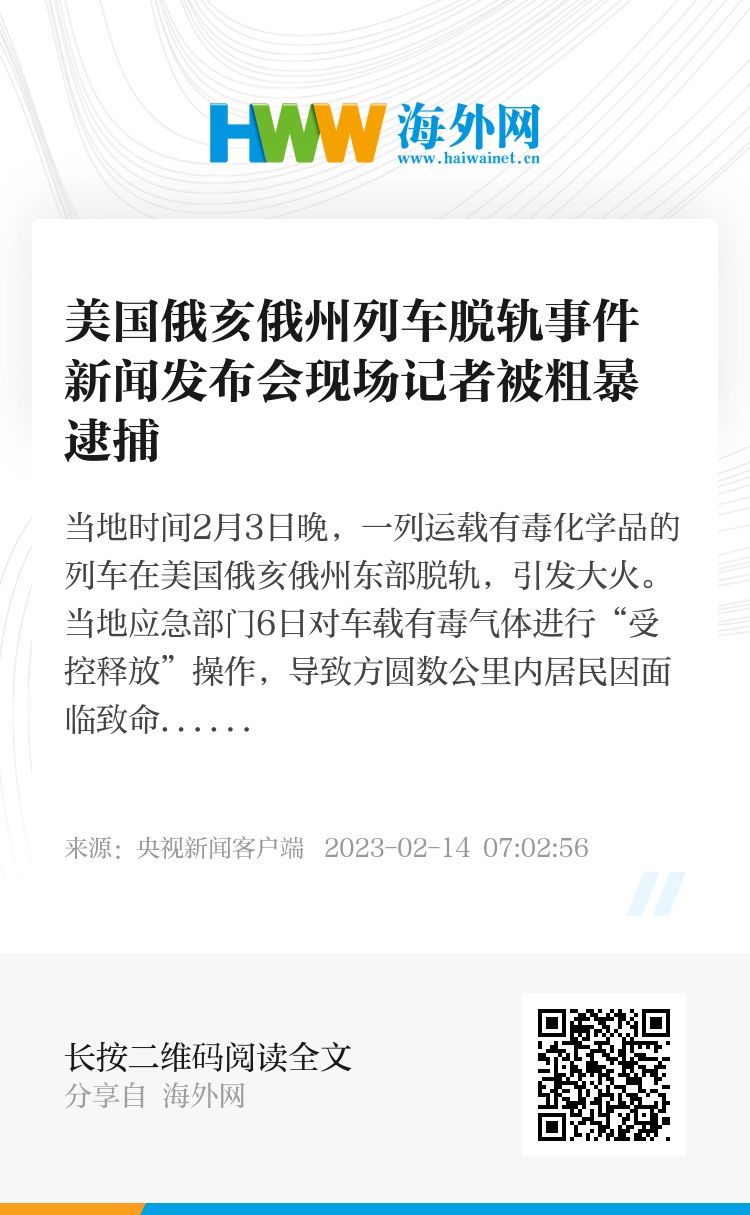 当地时间2月3日晚,一列运载有毒化学品的列车在美国俄亥俄州东部脱轨,引发大火。当地应急部门6日对车载有毒气体进行“受控释放”操作,导致方圆数公里内居民因面临致命气体威胁而紧急疏散。8日,在当地政府就此事故举行的新闻发布会上,一名记者在直播时被警方粗暴地逮捕,警方称这名记者擅闯发布会现场,该名记者被关押5小时后才被释放。