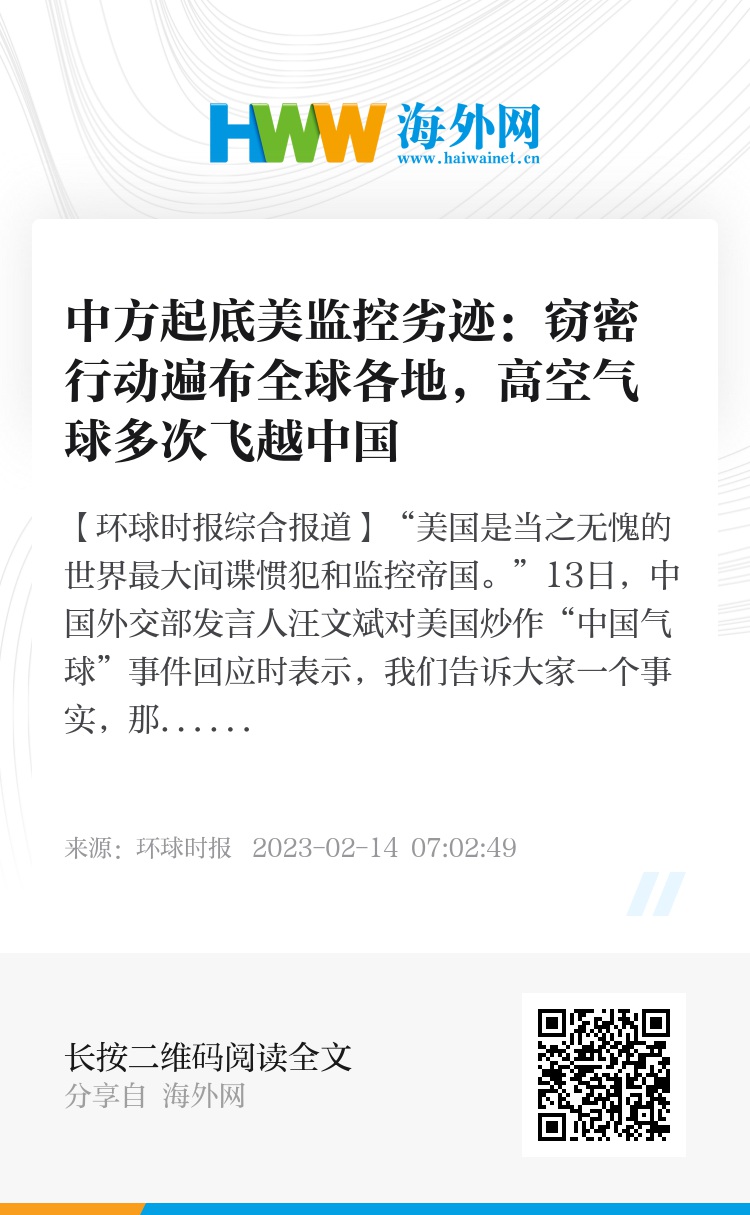 【环球时报综合报道】“美国是当之无愧的世界最大间谍惯犯和监控帝国。”13日,中国外交部发言人汪文斌对美国炒作“中国气球”事件回应时表示,我们告诉大家一个事实,那就是长期以来,美国滥用自身技术优势,对全世界包括其盟友进行大规模、无差别的监听窃密,行动遍布全球各地。不过,美国却一直“贼喊捉贼”,企图将污水泼给中国。近几天来,美方一边频频派先进战机击落“不明物体”,一边使劲渲染所谓“中国间谍威胁”。当地时间12日,美国军方在靠近加拿大边境的休伦湖上空再次出动战机击落一个“不明物体”,这是近8天内美国军机在美加上空进行的第四次同类行动。美方还没搞清楚这些“不明物体”的来源,北美防空司令部司令范赫克甚至声称不排除“不明物体”来自外星人。美方没完没了地利用所谓“不明物体”搞“政治秀”,在世界上引发了越来越多的嘲笑和质问。汪文斌表示,美方气球非法进入别国领空司空见惯,仅去年以来,美方高空气球未经中国相关部门批准,十余次非法飞越中国领空。他强调:“美方首先要做的应当是反躬自省、改弦更张,而不是到处污蔑抹黑、煽动对抗。”