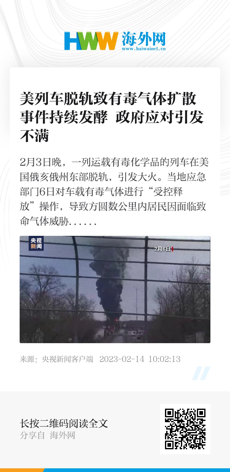 出事货运列车约有50节车厢,3日晚在俄亥俄州东部邻近宾夕法尼亚州的小镇东巴勒斯坦城脱轨,引发大火。据运营商诺福克南方公司介绍,有10节车厢装载有毒化学品,工作人员5日发现其中5节装载压缩氯乙烯的车厢释压装置停止工作,其中一节车厢内出现“急遽温度变化”,显现爆炸风险。6日,为避免灾难性后果,诺福克南方公司决定对上述5节车厢进行所谓“受控释放”操作,把氯乙烯排入一个事先准备好的坑道内引爆。“受控释放”操作于当天下午开始。当地媒体拍摄的视频显示,现场冒出火光,黑色的烟柱向上空升腾。