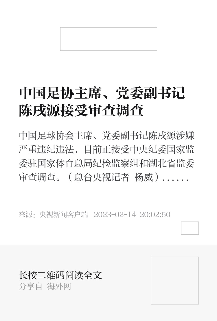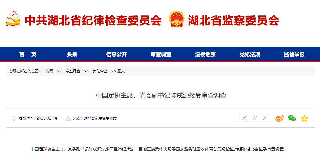 中国足球协会主席、党委副书记陈戌源涉嫌严重违纪违法,目前正接受中央纪委国家监委驻国家体育总局纪检监察组和湖北省监委审查调查。(总台央视记者 杨威)