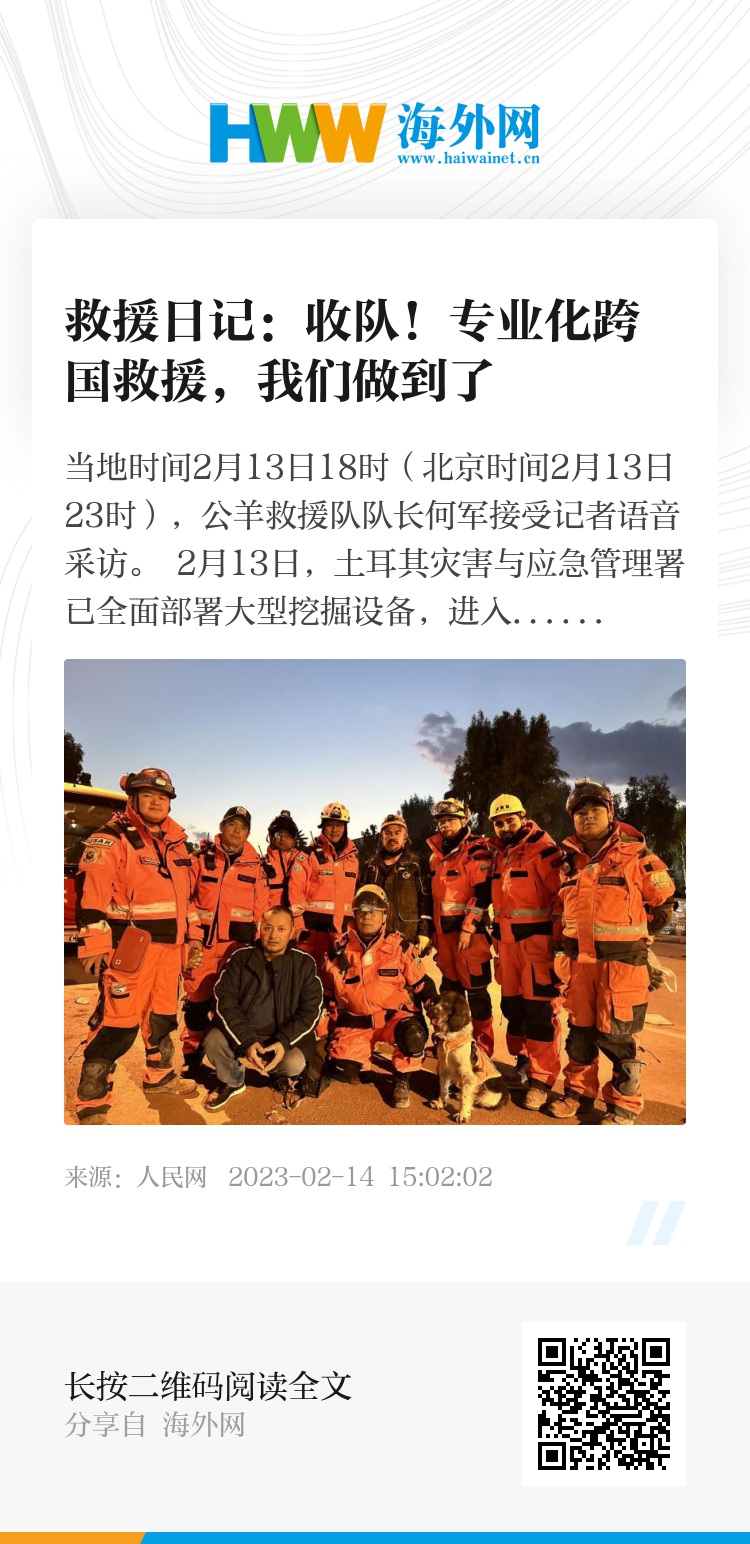 2月13日,土耳其灾害与应急管理署已全面部署大型挖掘设备,进入地震灾区作业。根据目前形势,公羊救援队救援协调指挥中心研判,我们已完成既定救援任务,可以撤离。