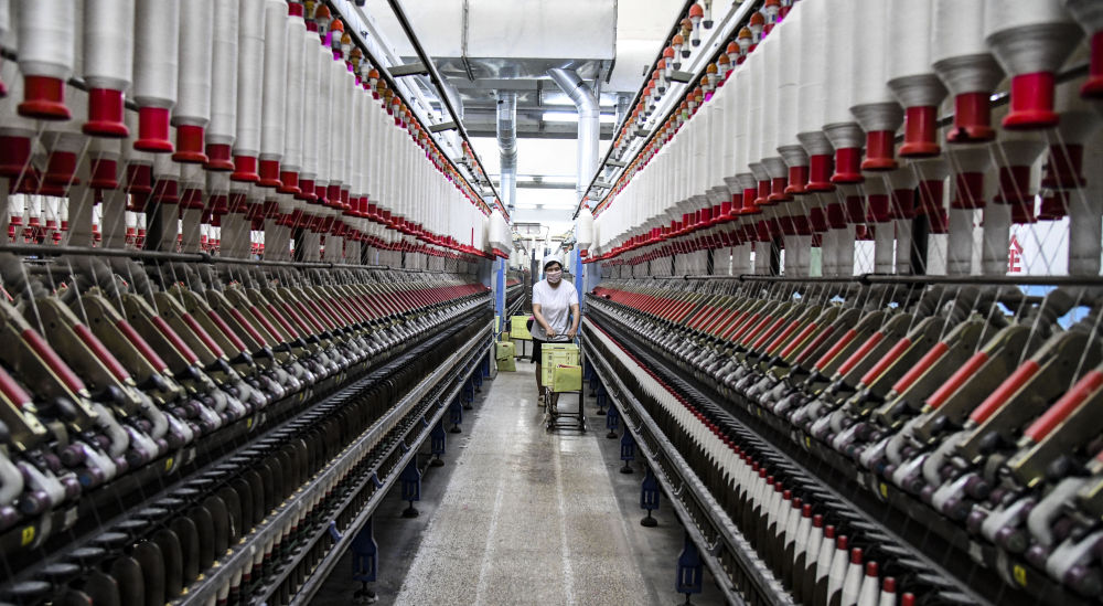 2月12日,工人在河南省济源市欣天纺织有限公司的生产线上作业。新华社发(苗秋闹摄)