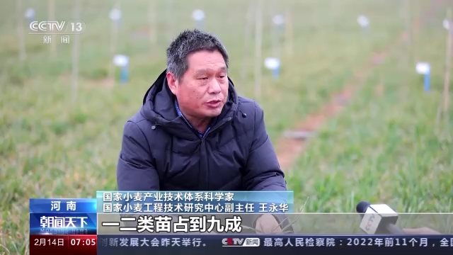 国家小麦产业技术体系科学家 国家小麦工程技术研究中心副主任 王永华:一二类苗占到九成,越冬抗寒性特别好,已经达到了冬天壮苗的标准,近五年来说是最好的苗情。